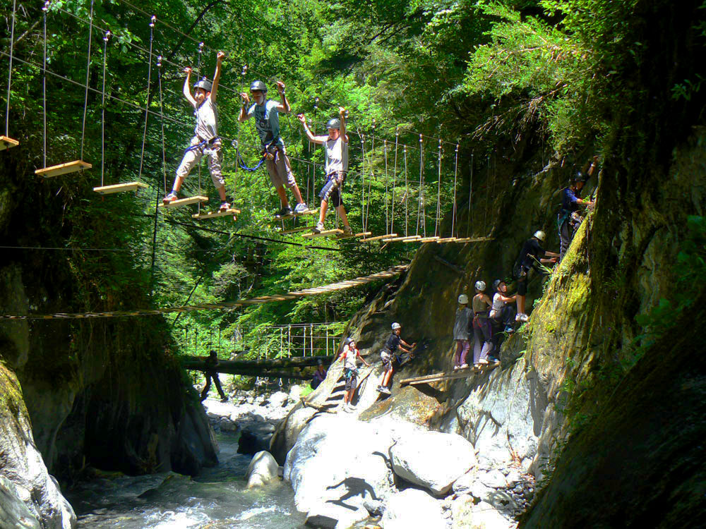 Dans une gorge au-dessus d'une rivière, cette activité est à mi-chemin entre le canyoning et l'escalade.D'une rive à l'autre c'est une succession d'ateliers sur cordes ou câbles au-dessus de l'eau : tyroliennes, via-ferrata, étriers, filets tendus, poutres d'équilibre au-dessus de l'eau, mâts de perroquet, ponts de singes, saut de Tarzan...